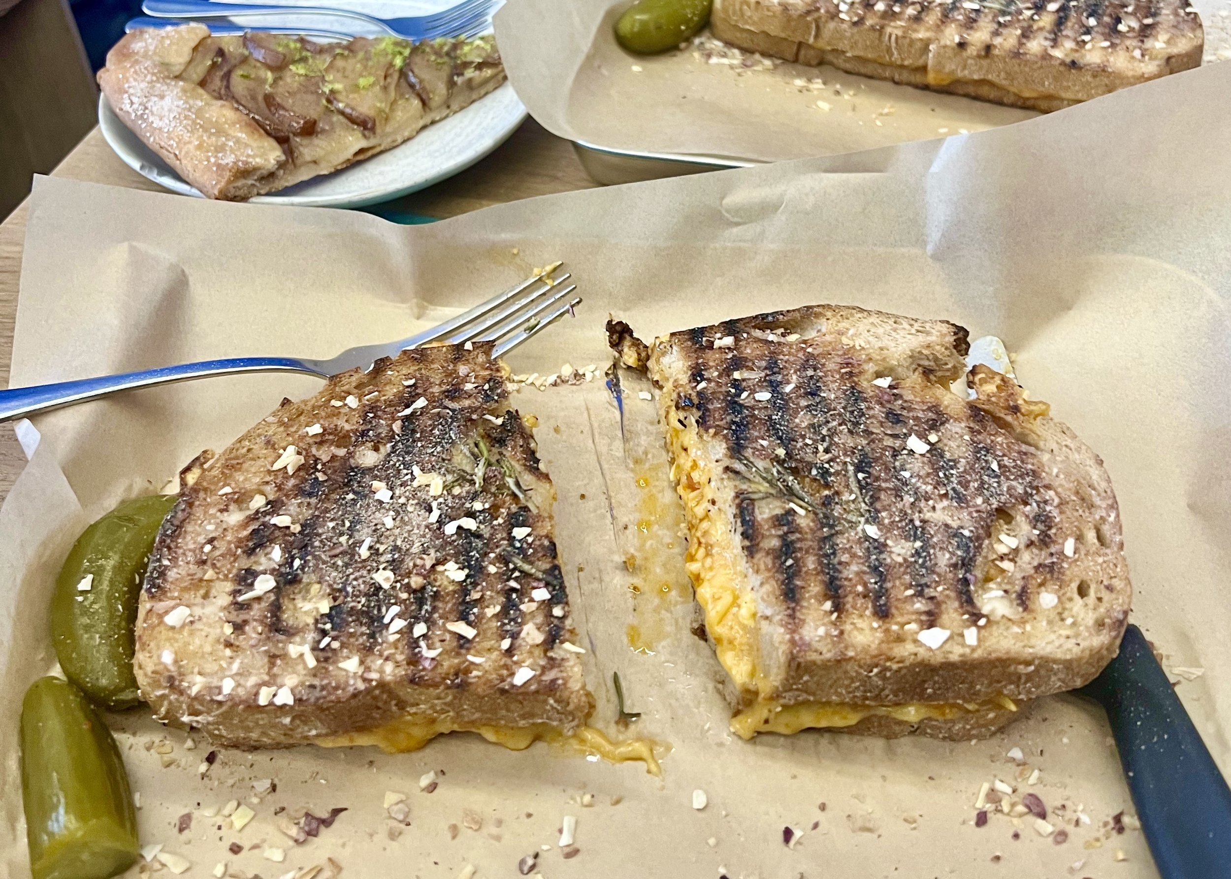 The grilled cheese is also seasoned with fresh rosemary, and the bread used is sourdough and gluten-free. If you have a little extra room they also have a seasonal vegan galette that I like. The one we tried was topped with pear.